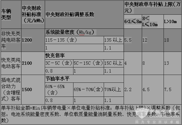 新能源客车补贴标准: