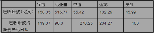 截至2017年底,宇通客车的应收账款为158.05亿元;中通客车的应收账款为55.42亿元;金龙客车的应收账款为102.29亿元。三家车企的应收账款分别占同期净资产的比重为 119.07%、270.25%和204.27%。新能源客车市场第二的比亚迪,应收账款在诸多新能源客车企业中金额最大,高达516.77亿元(含乘用车),占据其净资产的比例为98%,压力也很大;安凯客车2017年计提应收账款坏账准备金额为1.66亿元,计提其他应收款坏账准备金为0.48亿元,合计计提的应收款坏账准备达2.14亿元。而截至2017年底,安凯客车应收款(应收账款与其他应收款之和)为45.99亿元,同期,公司净资产仅为11.4亿元,应收款是公司净资产的4.03倍。而巨额应收账款的资产减值或将成为新能源客车企业的业绩杀手。
