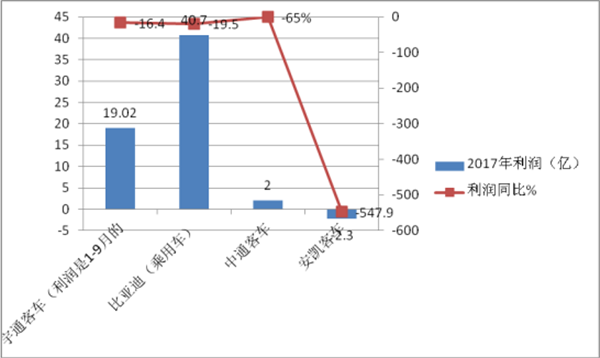 位居行业前三的中通客车(603559.SH)2017年年报显示,2017年度公司营业收入79.8亿元,同比下降13.7%;其预计2017年归属上市公司股东的净利润1.70亿至2.30亿,同比变动-70.98%至-60.75%,汽车整车行业平均净利润增长率为-5.19%。
