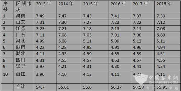 2、销量前10名主流区域市场的城乡公交车销量自2013年以来到2018均呈现逐年增大的趋势。