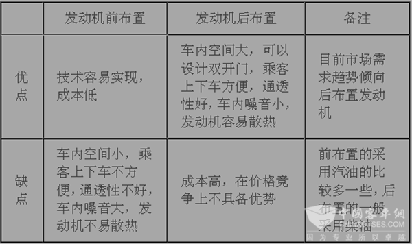 2、城乡公交车辆对发动机的布置要求。目前一般7~8米公交车发动机布置的方式有两种:有采取前布置的,也有采取后布置的。前布置与后布置各有优缺点,主要分析如下表: