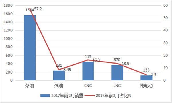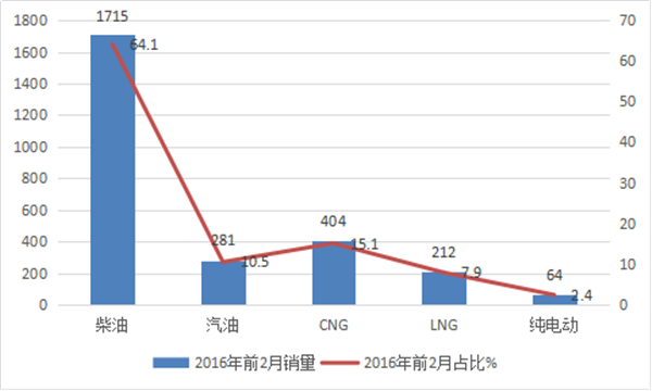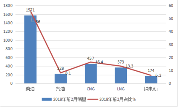 1、在2018年前2月5-8米城乡公交市场中,柴油占据了56%的市场份额,仍然是城乡公交中燃料动力的主体部分,但同比下降了近1.2个百分点。