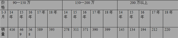 1、通过表一可以看出,2014年 1—3月份到2018年1-3月份,从价格在90万-150万之间的销售情况分析可知一直稳中有升,但前几年增幅一直处于个位数的缓慢状态,而到了2015年却出现了两位数的增幅,2016年一季度这一趋势更加明显,2017年则增幅收窄,2018年继续收窄。