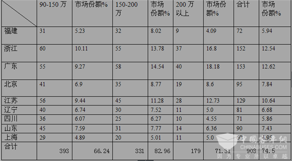 4、在150-200万价格区间。90万以上高档客车集中度最高,达到82.96%,留给其他区域市场的机会只有17%,这给国内生产高端客车的客车企业在目标市场定位和制定区域市场营销策略方面都提供了有力的依据。