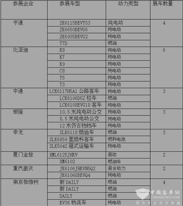 2018年4月20日,为期三天的“CTIB2018天津国际客运交通装备与技术展览会”(以下简称:“天津客车展”)在天津梅江会展中心开幕。本届展会以“绿色﹒平安﹒智慧﹒节能为主题”为主题,宇通、比亚迪、中通、银隆新能源、厦门金旅、重汽豪沃、申龙、南京依维柯等8家客车企业,携27款整车参展,参展的主要厂家及车型如下表:
