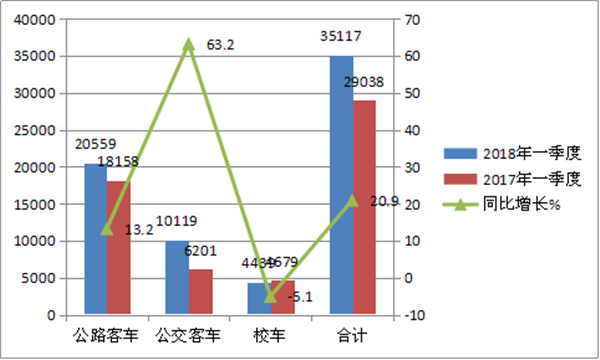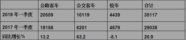 根据中国客车统计信息网统计,2018年一季度各客车细分市场累计销量及同比如下表: