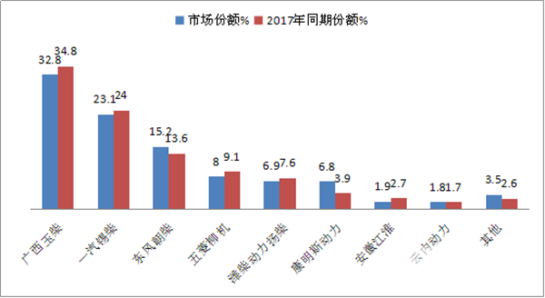 1、玉柴发动机占比最大,但同比下降2个百分点,也是下降幅度最大的动力品牌。