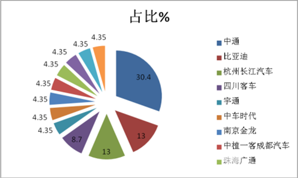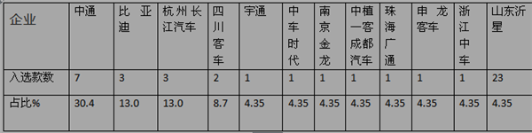 特点二:中通客车入选车型最多,其次是比亚迪和杭州长江汽车