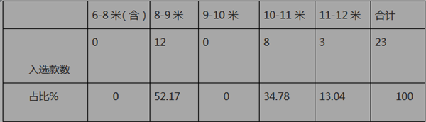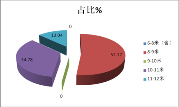 特点三:8-9米长度段车型占据超过半壁江山,权重为最大;其次是10-11米车型占比为34.78%;11-12米占比13.04%;6-8米为零,9-10米为零。