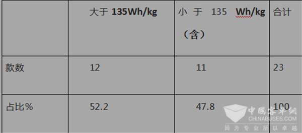 随着2018年补贴政策对电池能量密度要求的提高,客车企业在申报目录时,尽量用高能量密度的动力电池来配套新能源客车,以便达到补贴要求。本次目录中52.2%的电池能量密度都到达135 Wh/kg以上就是有力的证明,这些车型均可以获得1.1倍补贴。