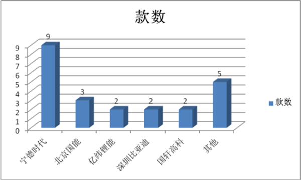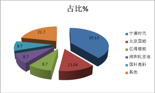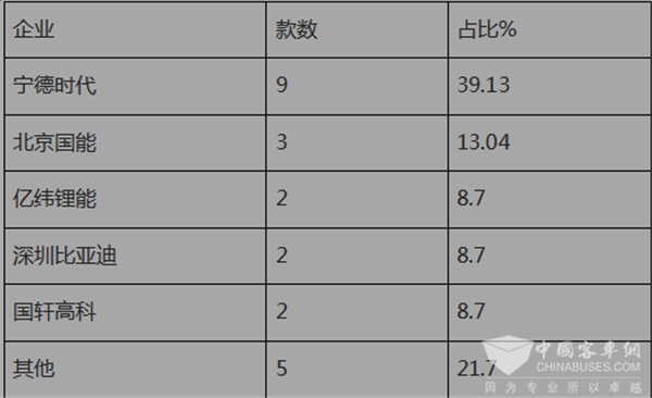 电池系统能量密度超过135Wh/kg的产品分别搭载的是宁德时代、北京国能、亿纬锂能、深圳比亚迪等企业生产的电池。其中宁德时代占比达到39.13%为最多。
