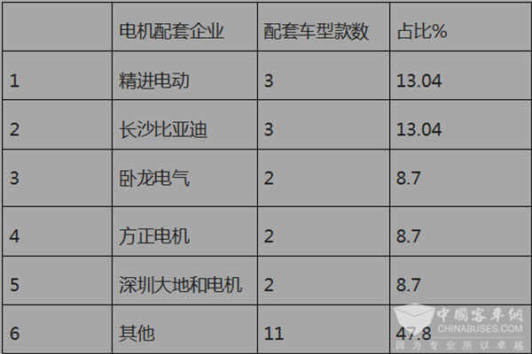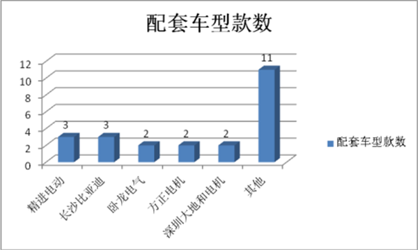 特点七:精进电动和比亚迪提供的电机配套的车型最多,但占比都不大,电机配套竞争比较分散