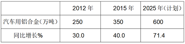 铝的密度仅有钢铁的 1/3,导热性却比铁高出3倍有余。最值得一提的是,铝代钢的结构设计优化可以实现二次减重,效果可直接减重50%-100%。相关研究表明,汽车使用1 kg铝可替代自重2.25 kg钢材,减重比例高达125%,整个使用寿命周期内可减少废气排放20 kg。由此可见,铝合金凭借其高强度、可循环性、耐腐蚀、密度低等优质性能成为汽车减重首选材料,铝材在汽车上的使用量将快速增长,汽车用铝进入黄金期。下表是北美地区汽车行业用铝数据(数据来源于方正证券研究所):