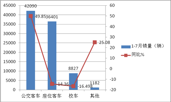 与往年比1-7月份,公交车累计销售42090辆,同比增长49.85%;座位客车累计销售36401辆,同比下降14.36%;校车累计销售8827辆,同比下降16.49%;其他车型累计销售1182辆,同比增长25.08%。
