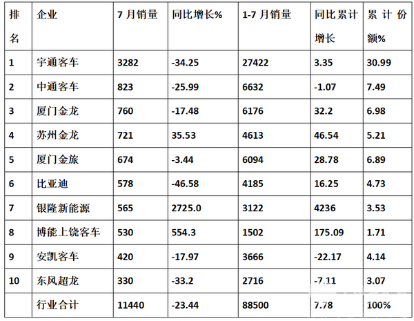 备受行业关注的“两通三龙”和“比亚迪”,7月占据了行业前6席位。其中,宇通第1,中通第2,厦门金龙第3,苏州金龙第4,厦门金旅第5,比亚迪第6。仅苏州金龙在7月月度销量实现了同比正增长,其他“五强”分别出现了不同幅度的下滑。事实上,月度排行前10的企业仅3家企业实现增长,下滑成了7月客车市场的常态。然而1-7月累计销量来看,则只有3家企业同比下滑,为中通、安凯和东风超龙,其中安凯降幅超两成。累计销量排行前10的企业依次为:宇通、中通、厦门金龙、苏州金龙、比亚迪、安凯、银隆新能源、东风超龙和东风襄旅,各家企业市场份额具体如下: