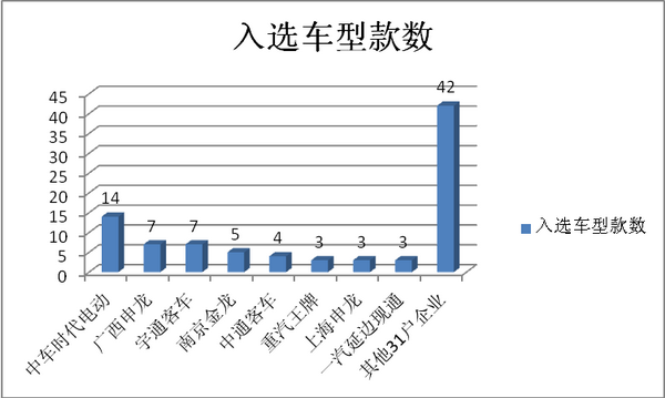 特点二:从入选企业看,中车时代电动入选车型数量最多达14款,,仅7家客车生产企业入选车型数量为3款或以上,其余32家客车生产企业入选车型为2款或1款,入选车型集中度不高