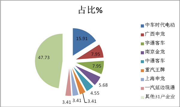 2、 其中中车时代电动入选车型最多达到14款,占比为15.91%,前8家企业入选的车型达到46款,占据的比重为52.27%,其余31家入选车型占据的权重为47.73%,集中度不算太高。