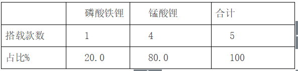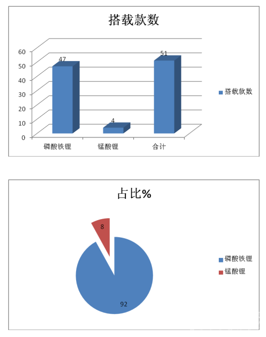 特点三:搭载动力电池中,磷酸铁锂占绝对优势,其次是锰酸锂
