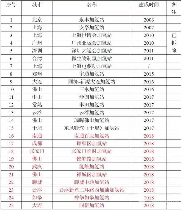 氢燃料电池客车的普及离不开加氢站等基础设施的建设,据不完全统计,截至2018年12月,中国共有25座建成的加氢站(其中3座已拆除),另有多座在建,但多数仅供示范车辆加注使用,暂未实现全商业化运营。