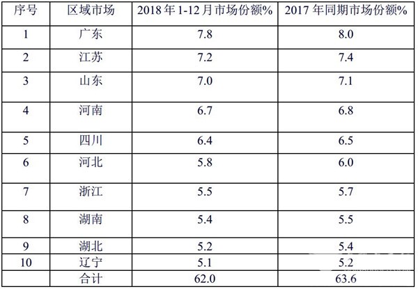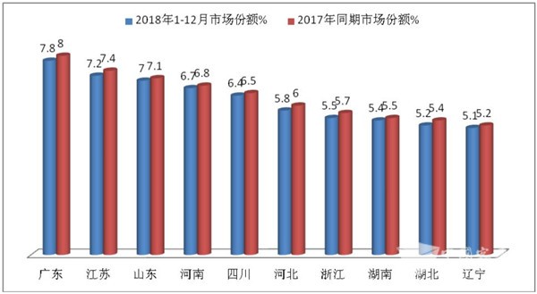 从上图表看出,2018年1-12月,上述十大区域长途公路客车占据的市场集中度为62.0%,同比降低1.6个百分点,广东区域份额最多。
