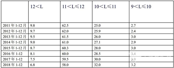 从上图表看出:在近5年1-12月中可知,一方面11-12米公路客车是长途公路客车中最大的权重,超过半壁江山。另外一方面11-12米的权重在逐年呈现下滑。主要原因是: