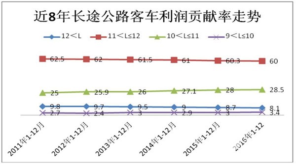 2、根据市场调研,11-12米公路客车主要承担运距在200公里以上的省级市与地级市、地级市与地级市、跨省的城际线路等长途客流运输任务。是公路客车企业的实力象征,是公路客车制造企业的核心利润来源,主流客车企业的利润大约有50%来自11-12米公路客车的贡献。