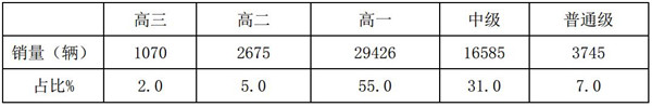 众所周知,长途公路客车都有营运等级要求,根据统计,2018年1-12月,长途公路客车的营运等级销量结构统计如下表:
