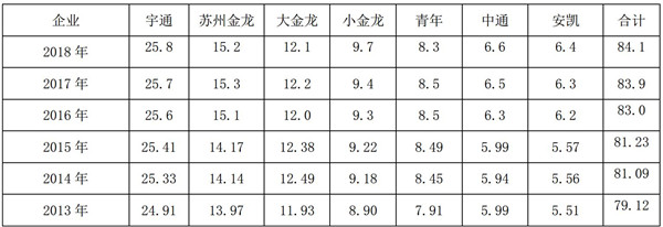 根据上牌数据查阅计算,主流客车企业2018年及近5年在沿海七大主流区域公路客车市场份额比较表(%)