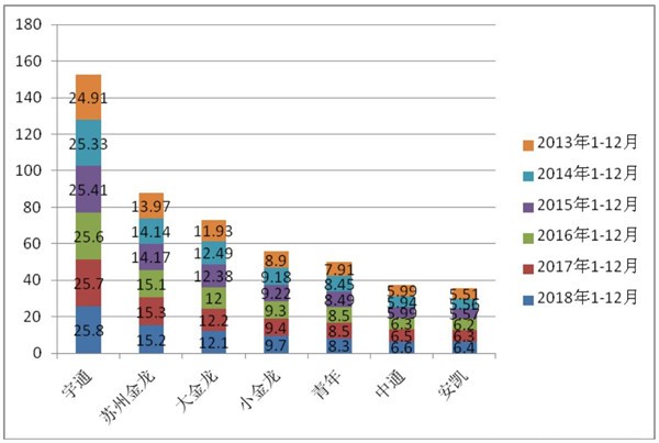 特点二、宇通是霸主,三龙、中通、青年、安凯等市场集中度超过80%,且呈现逐年上升态势