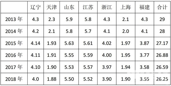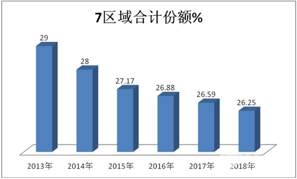 沿海7区域近6年的公路市场中的客运车型份额在逐年缩小,即从2013年的29%逐年缩小到2018年的26.25%。