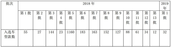截止到2019年2月,2018年-2019累计发布了14批新能源客车推荐目录,其中2019年第1批入选的车型款数位列第四低。