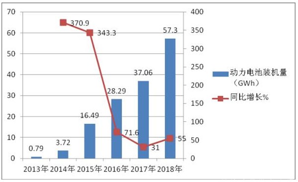 动力蓄电池装机量销量也随之逐年递增。2018年,我国动力蓄电池装机量量已达57.3GWh(近年动力电池装机量数据见下表图,数据来自高工产业研究院)。