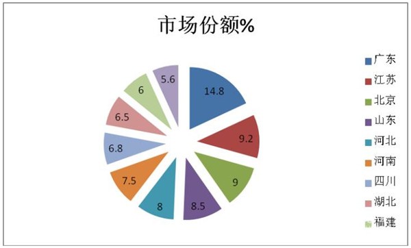 1、2019年2月广东、江苏、北京是销量最多的前三甲,广东最多,占据市场份额为14.8%,是市场份额唯一超过10%的销售大区。