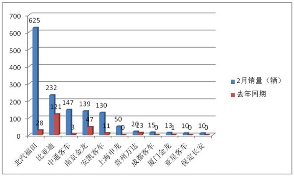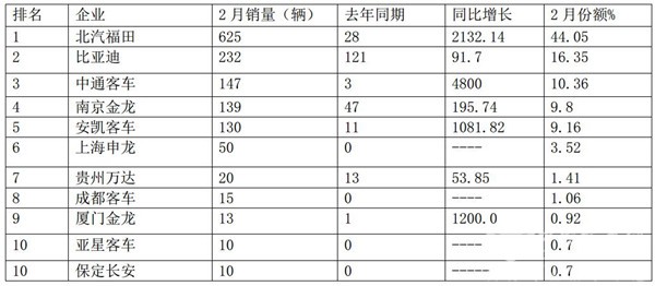 根据中国客车统计信息网统计,2019年2月新能源客车销量前10名排序如下: