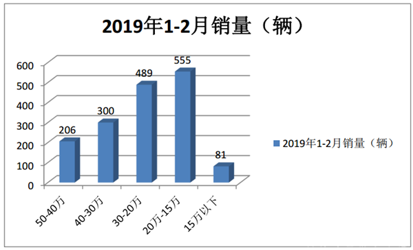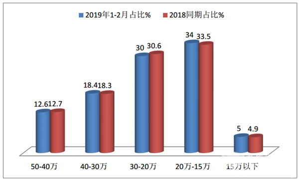 3、 2019年1-2月月15万以下的价格区间销量占比微增;