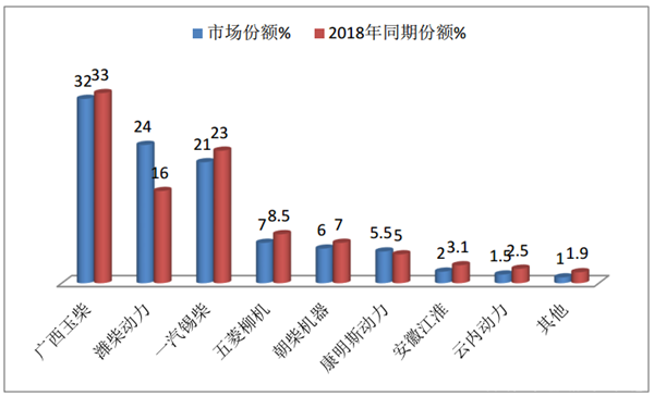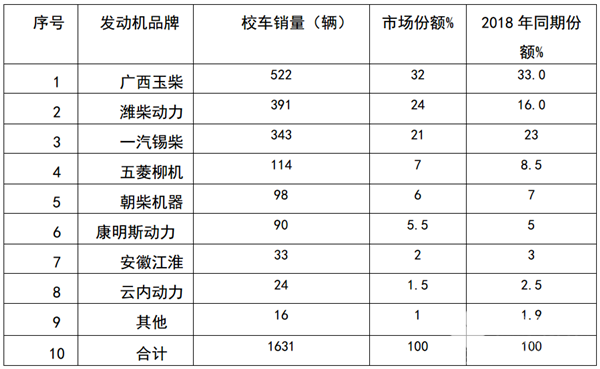按发动机品牌划分,2019年1-2月校车的销量及份额统计表如下: