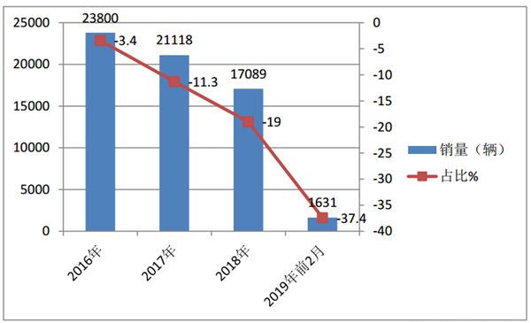2016年销量为23800辆同比下降3.4%;2017年校车销量21118辆,同比下降11.3%;2018年销量为17089辆,同比下降近19%,2019年前2月销量1631辆,同比下降37.4%,可以说是“江河日下。