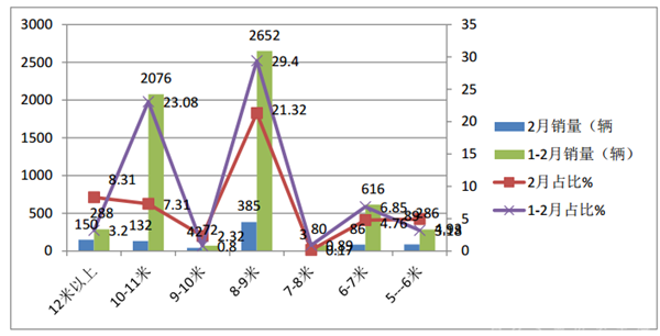 一、2月及1-2月11-12米段公交销量均是“一枝独秀”,2月权重超过半壁江山,1-2月超3成