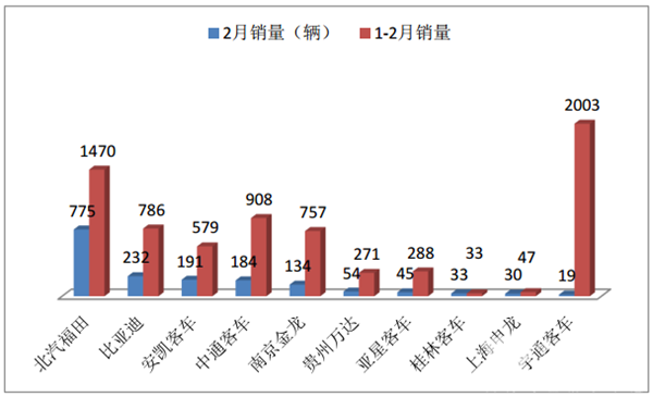 1、2月福田、比亚迪、安凯居前三甲,公交企业座次重新排列;同比增长最大的是福田汽车,增长27.7倍;2月宇通客车同比下降96.71%,是下降最大的企业。