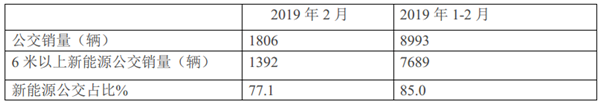 可见,在2019年2月及1-2月中,新能源公交占据公交市场的权重都很大,分别是77.1%和85.0%,这足以说明,新能源公交仍然是2019年前2月公交客车市场的最大贡献者。
