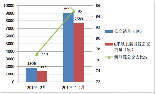根据中国客车统计信息网统计,2019年2月,中国客车行业5米以上公交销售1806辆,同比增长9.79%,1-2月5米以上公交客车累计销量8993辆,同比增长66.72%。根据近期调研,目前作为公交车型主力的新能源公交在运营中普遍存在一些不足,现将2月及1-2月公交市场特点及运营中存在的问题及对策研析之。