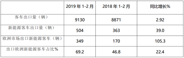 4、2019年前2月同比看,出口欧洲新能源客车占比比2018年同期提高22.4个百分点。
