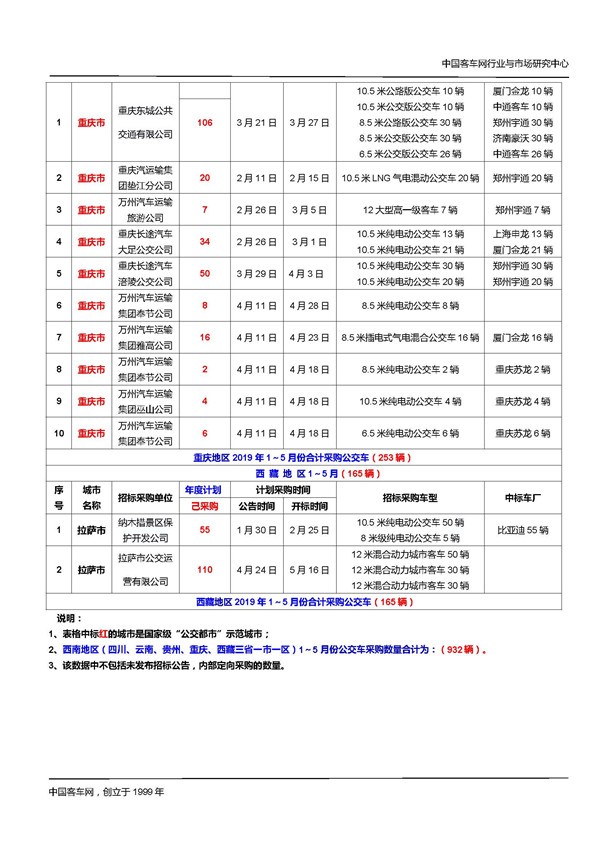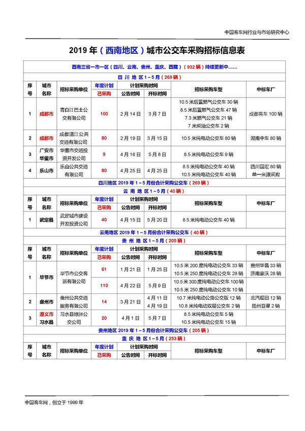 2019年(西南地区)城市公交车招标信息动态统计(常更新)