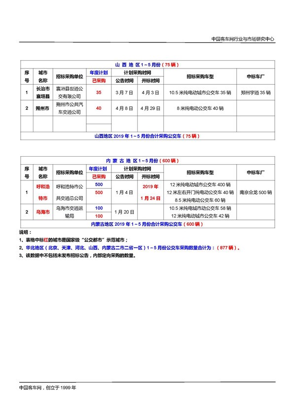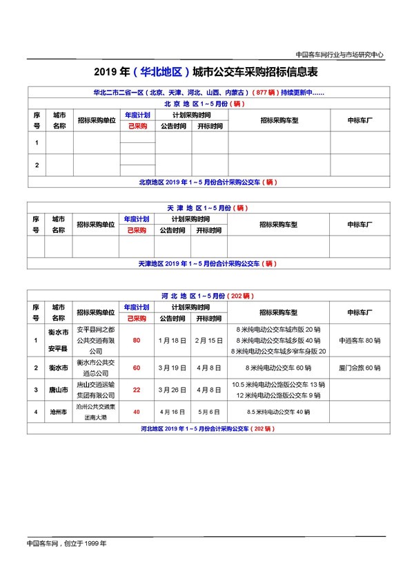 2019年(华北地区)城市公交车招标信息动态统计(常更新)