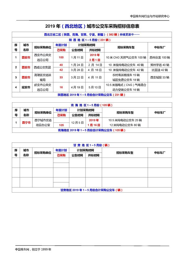 2019年(西北地区)城市公交车招标信息动态统计(常更新)