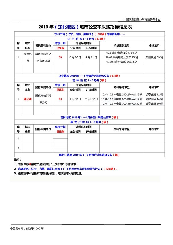 2019年(东北地区)城市公交车招标信息动态统计(常更新)
