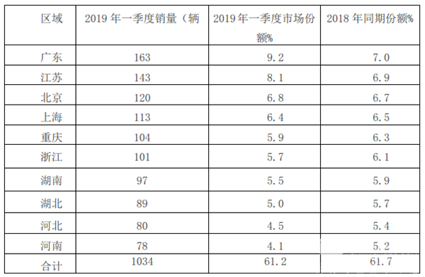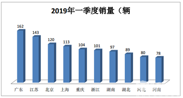 根据最新上牌信息,2019年前3月全国市场共计销售混合动力客车1710辆,主流区域市场分布如下: