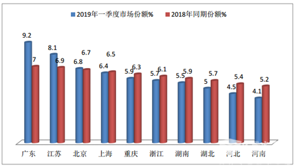 1、广东、江苏、北京、上海等4个重点区域市场的份额均在6%以上,其中广东一家独大,市场份额达到9.2%,前4家累计超过3成的份额,达到30.5%。