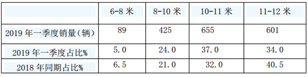 可见,2019年前3月按长度段划分插电混合动力客车销量特征是: