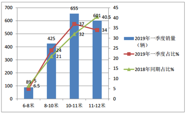 根据上牌信息,2019年前3月插电混合动力客车在各个长度区间销量统计: